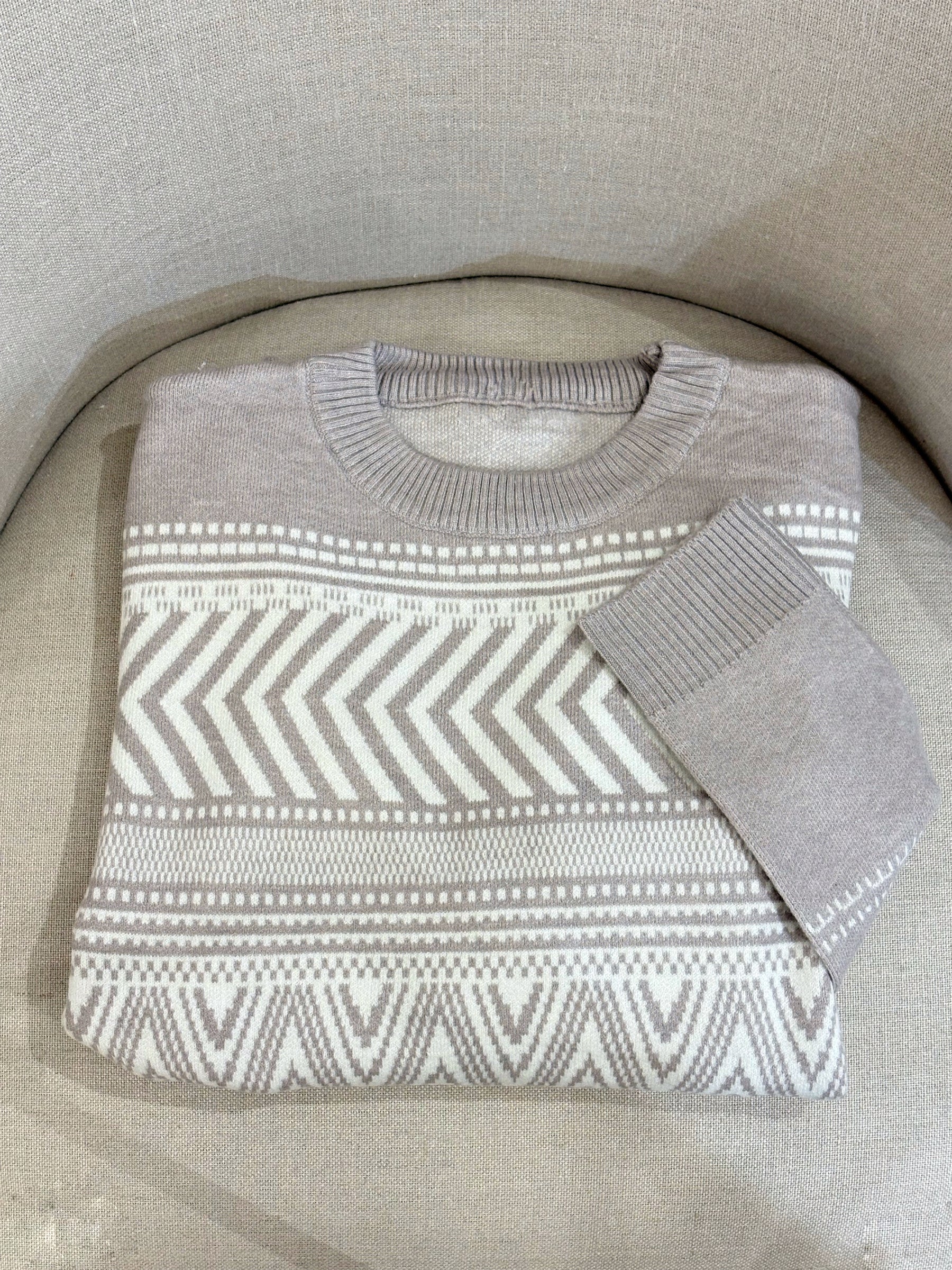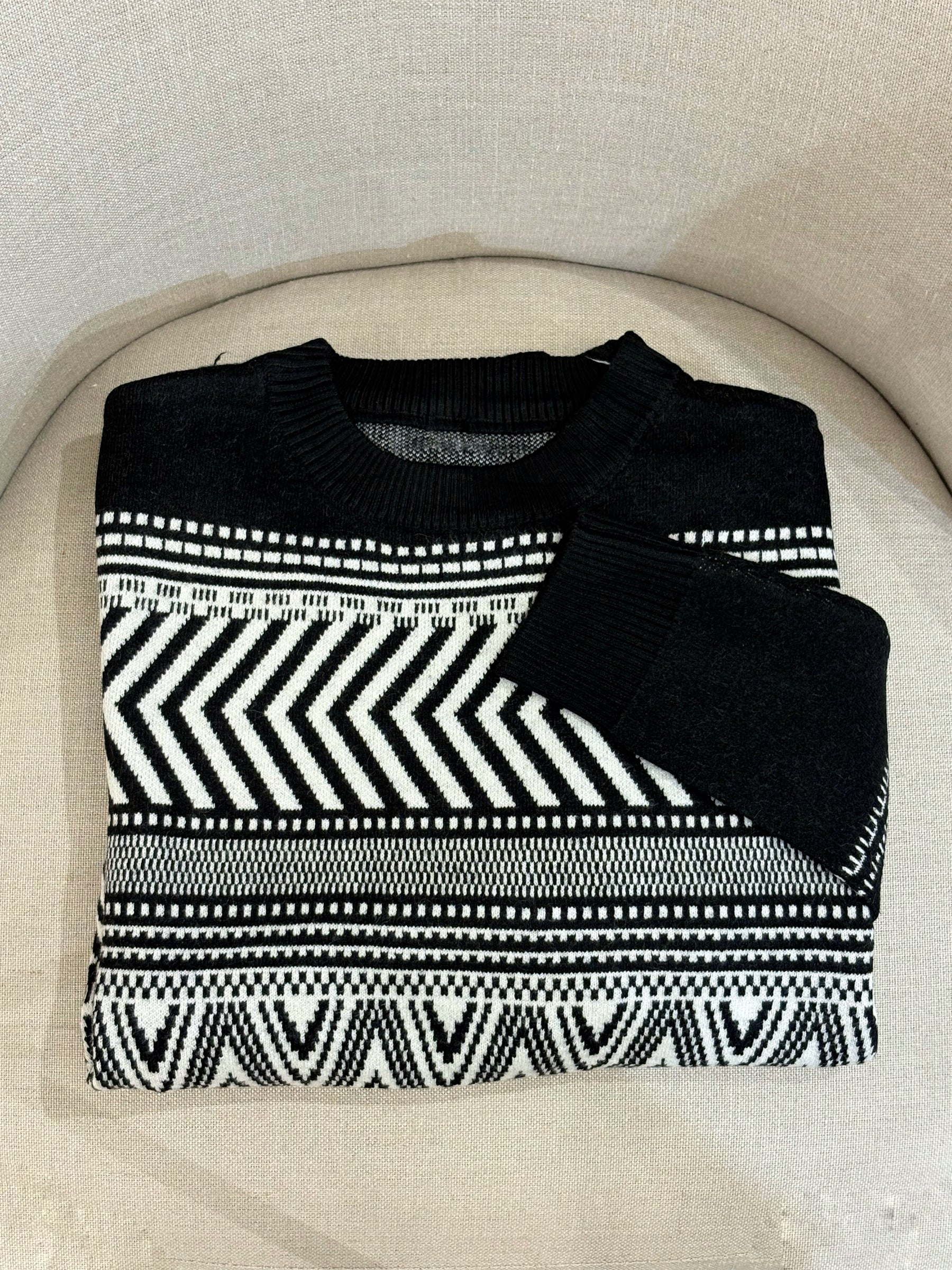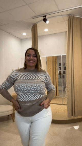 Jersey de punto suave con estampado geométrico disponible en varios colores. Confeccionado en lana acrílica y algodón, ofrece una textura cálida y cómoda ideal para el invierno. Corte clásico y cuello redondo. Perfecto para un look casual con un toque bohemio.