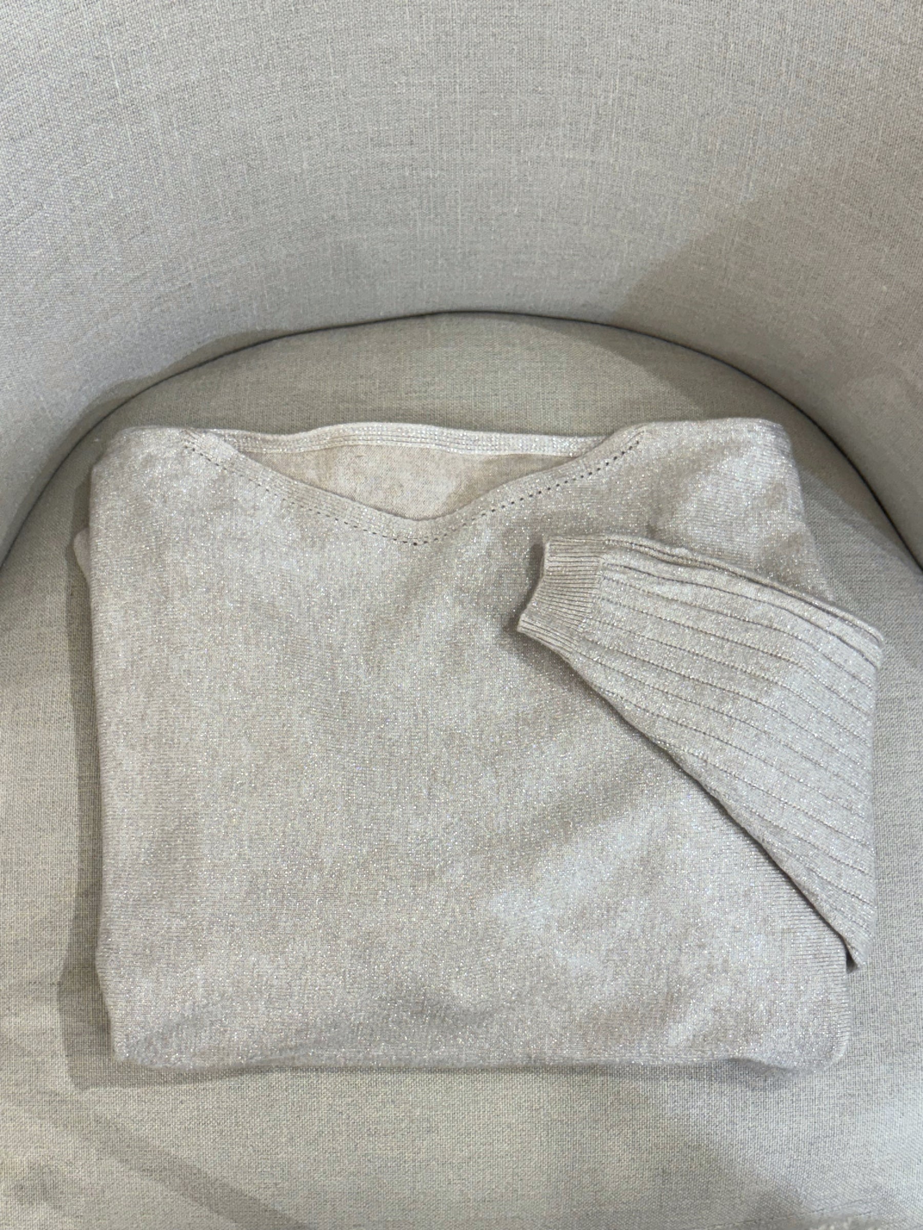 Jersey de punto fino en tono beige claro, confeccionado en mezcla de algodón y viscosa para un tacto suave y agradable. Diseño minimalista con cuello redondo y mangas acanaladas. Una prenda versátil que combina con todo, perfecta para fondo de armario.