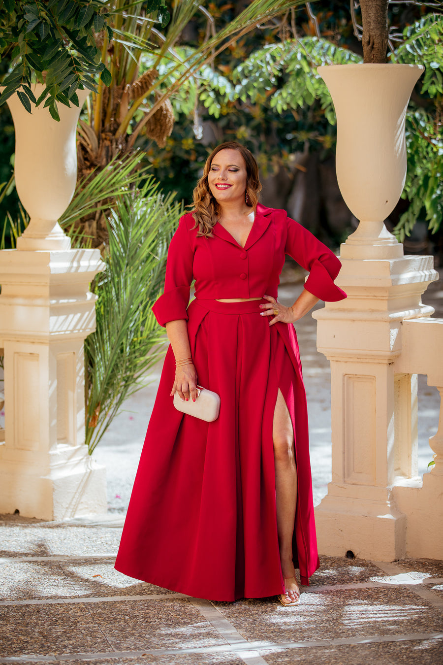 - Top corto: Diseñado para acentuar la figura de manera elegante, este top es ideal para combinar con la falda de tiro alto del conjunto.
