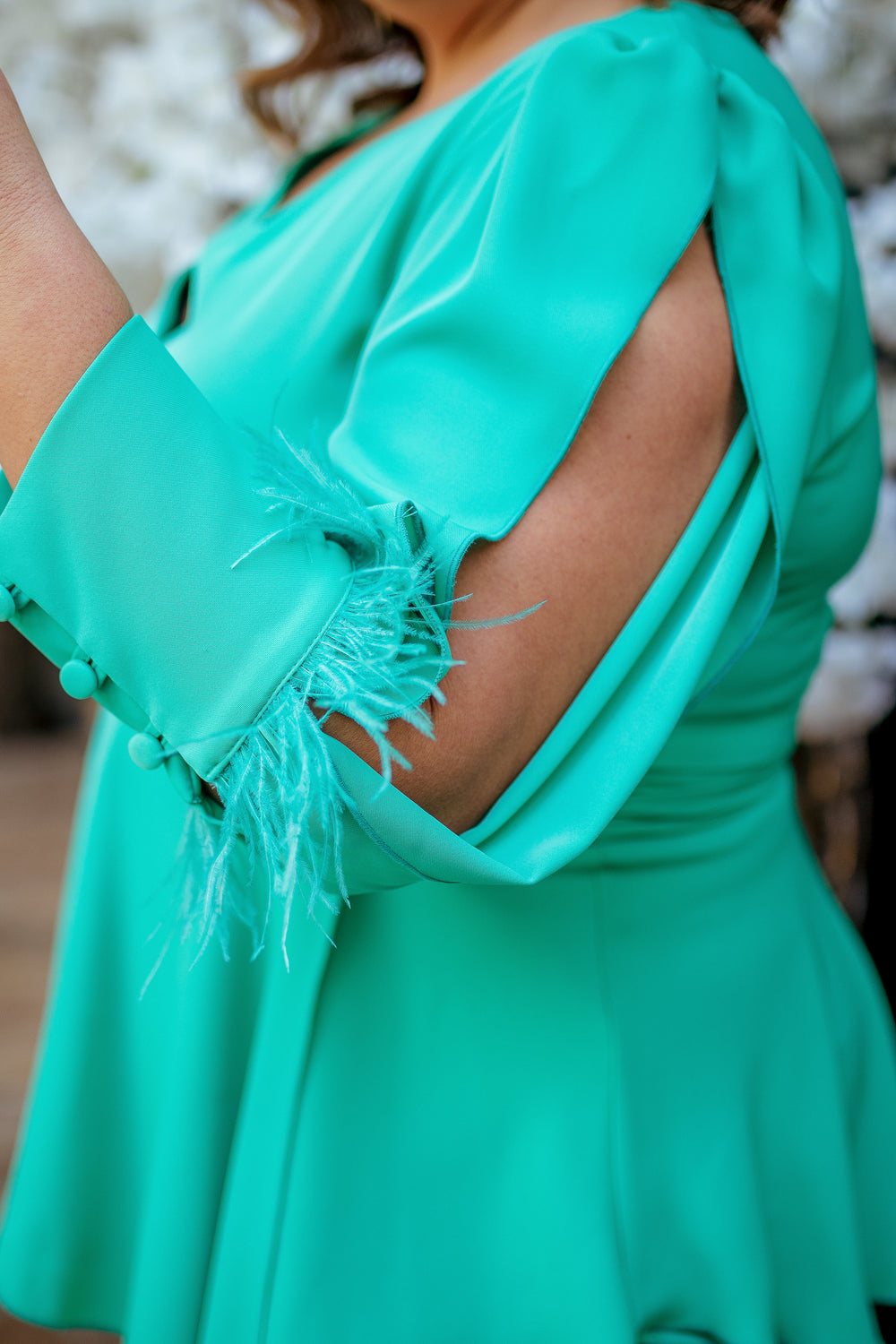 • Plumas sintéticas en las mangas: Detalles únicos que hacen la diferencia. Las plumas sintéticas en las mangas añaden un toque de distinción y originalidad al vestido.