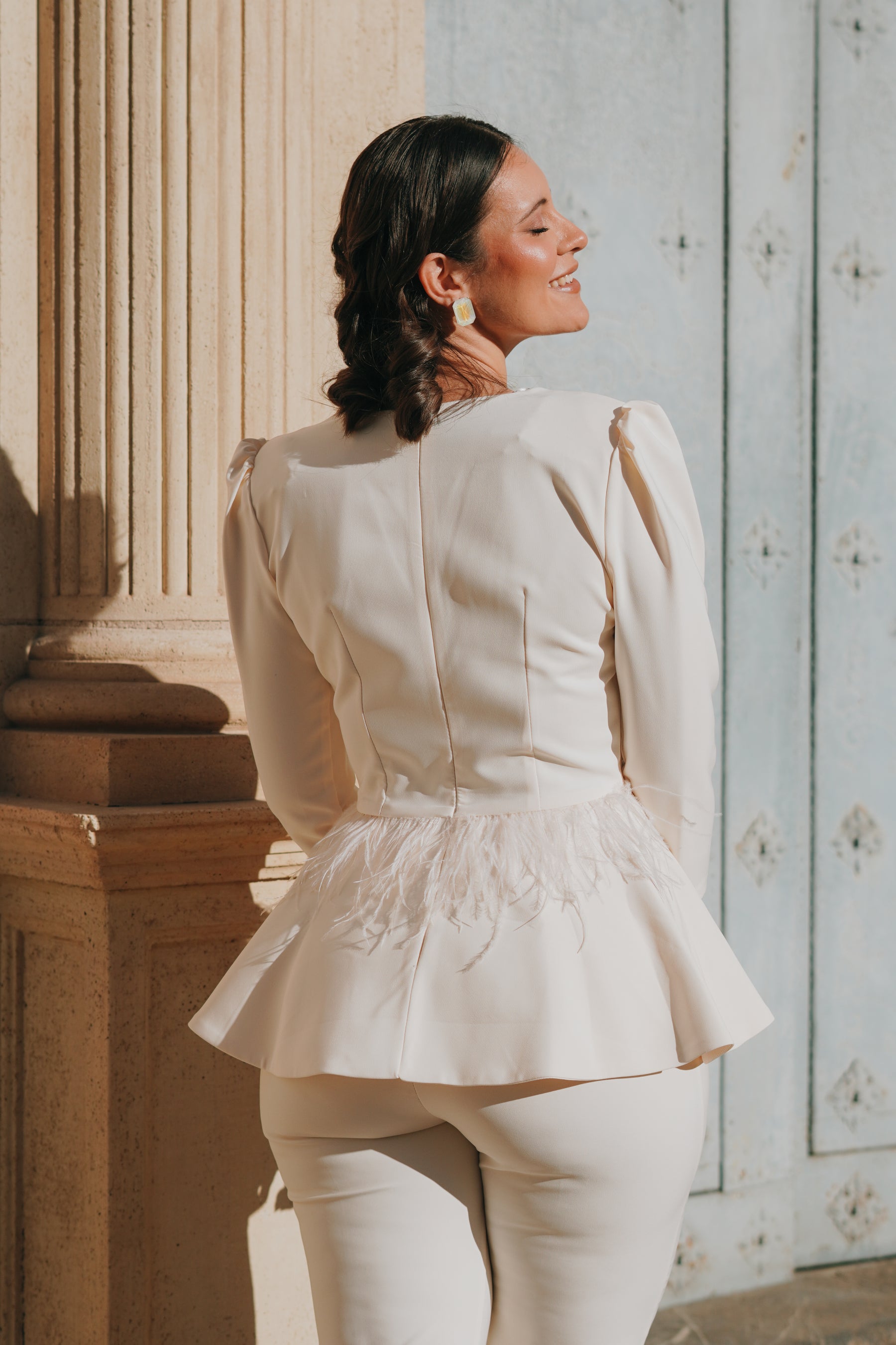 -Detalle de peplum con plumas en la cintura que estiliza y marca la silueta.