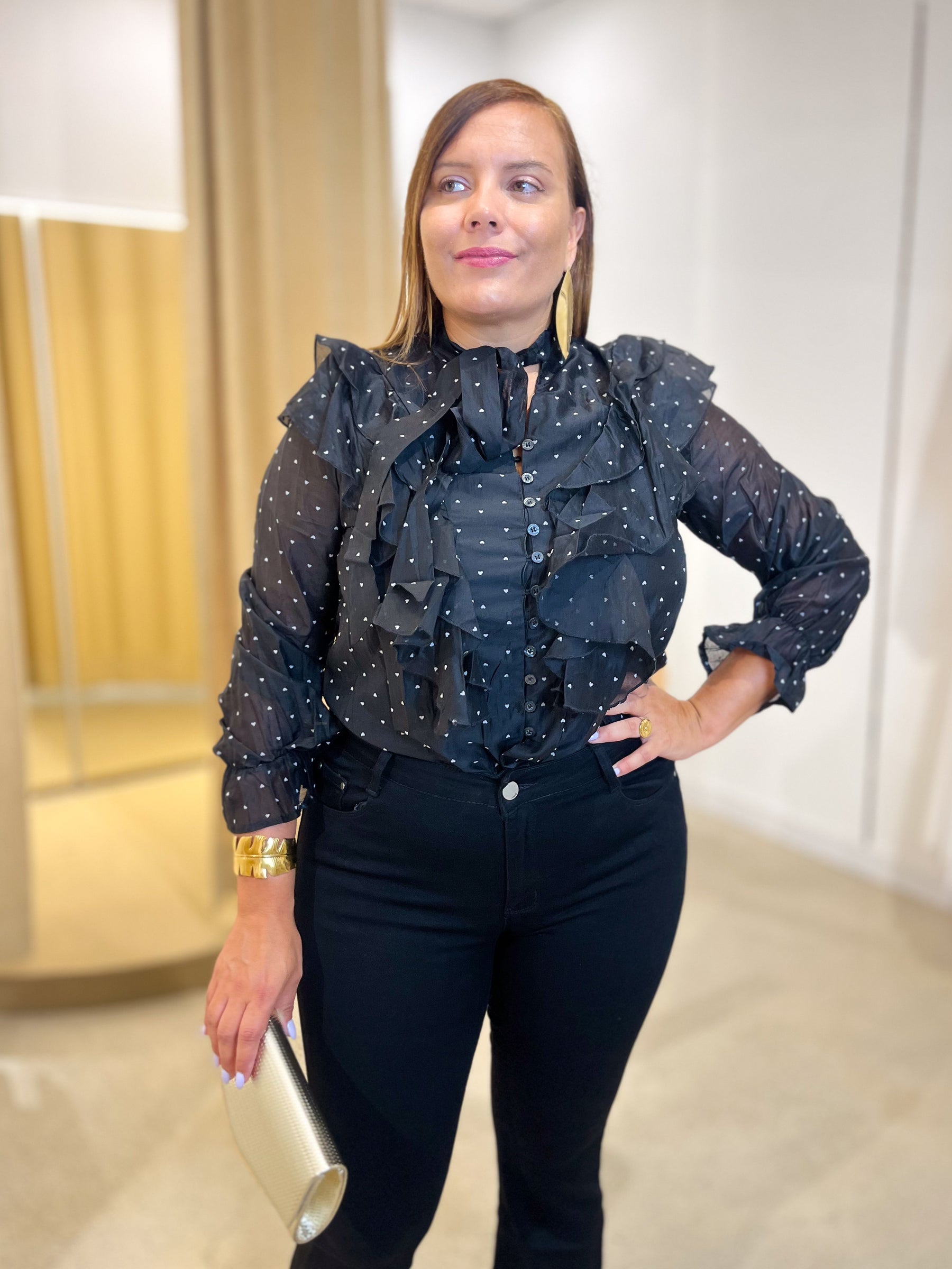 - Tejido de gasa con chorreras decorativas para darle un toque sofisticado a la camisa.