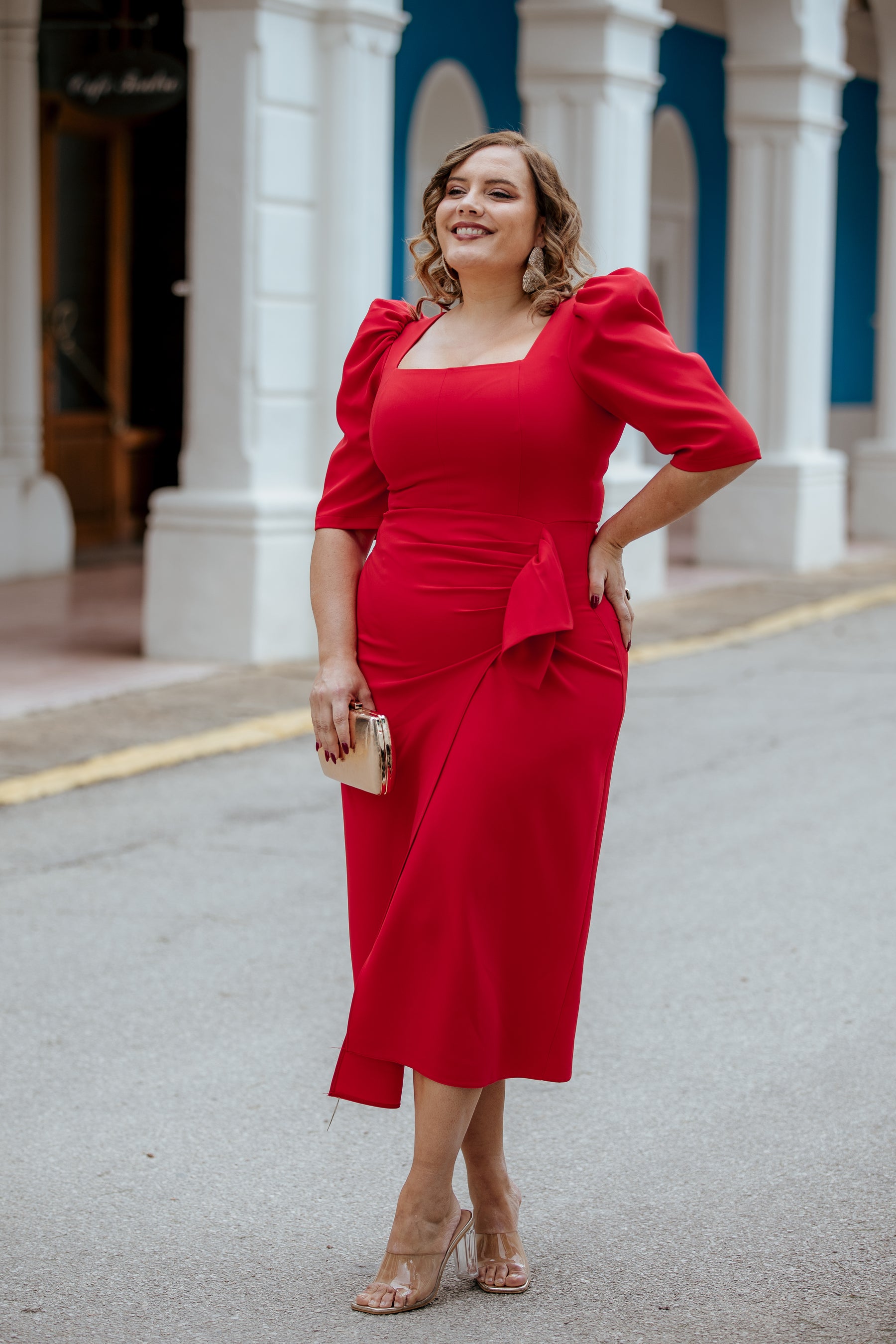 Este vestido midi en rojo clásico es de esos que entran en una boda y se nota (sin necesidad de presentarse). Su silueta entallada realza la figura con un patrón muy favorecedor, mientras que las mangas abullonadas y el drapeado con lazo en la cadera le dan ese toque especial que convierte un “voy mona” en “voy de invitada PRO”.