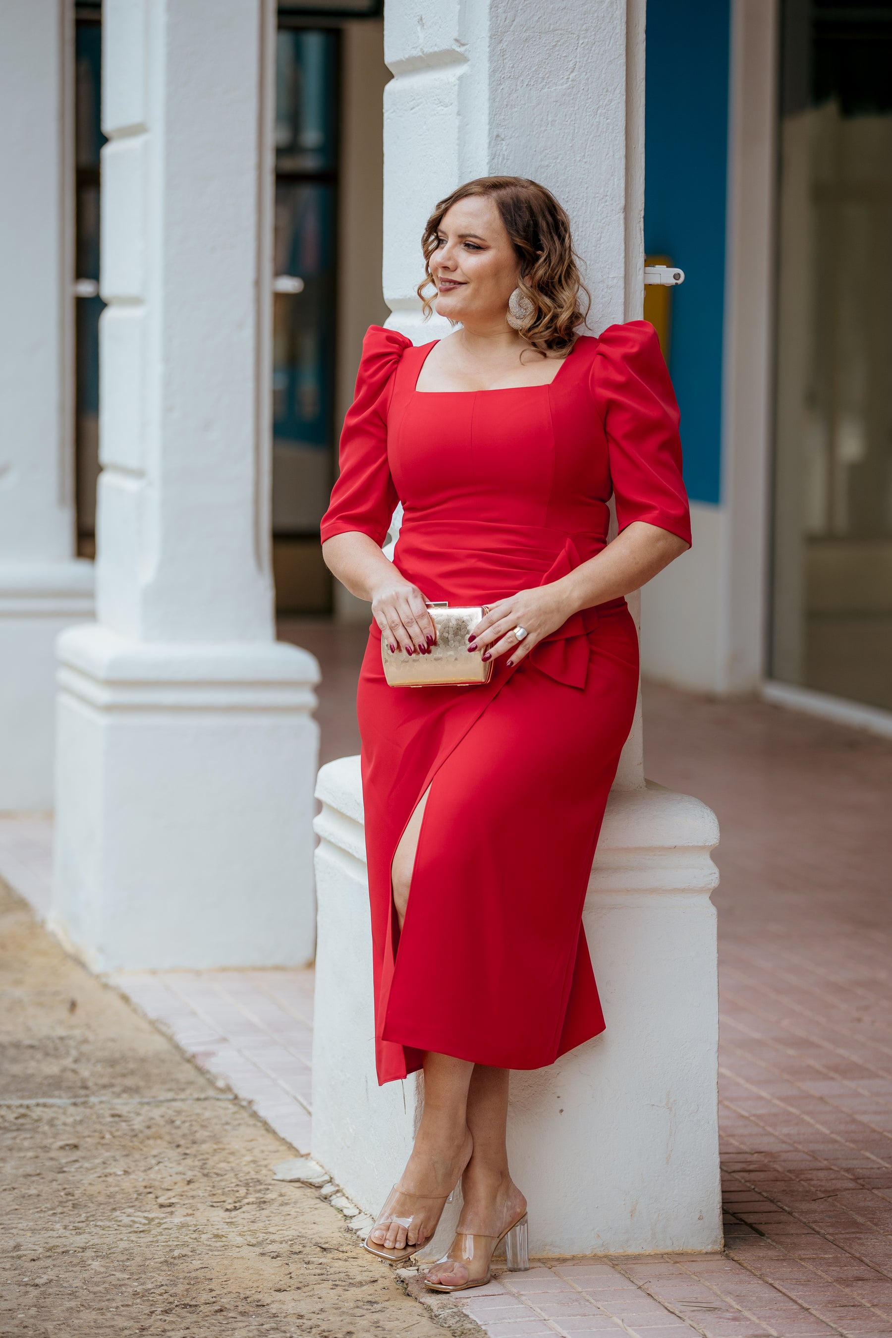 Vestido midi rojo con mangas abullonadas y lazo lateral