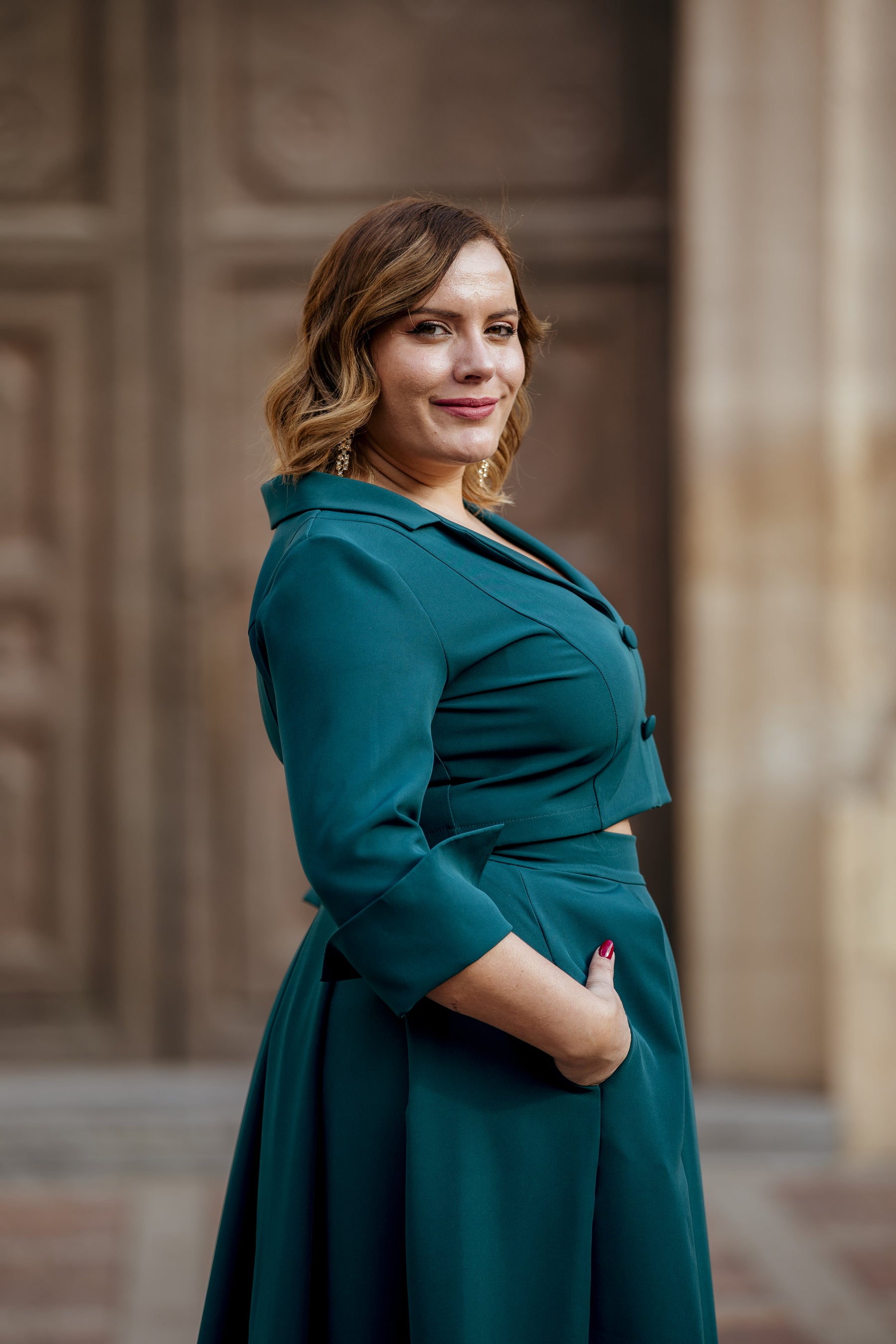 Este top verde petróleo destaca por su diseño estructurado tipo chaqueta, que aporta presencia y elegancia al look. Es una prenda pensada para estilizar la parte superior del cuerpo, marcar ligeramente la cintura y elevar cualquier conjunto de invitada sin necesidad de recargar con accesorios.
